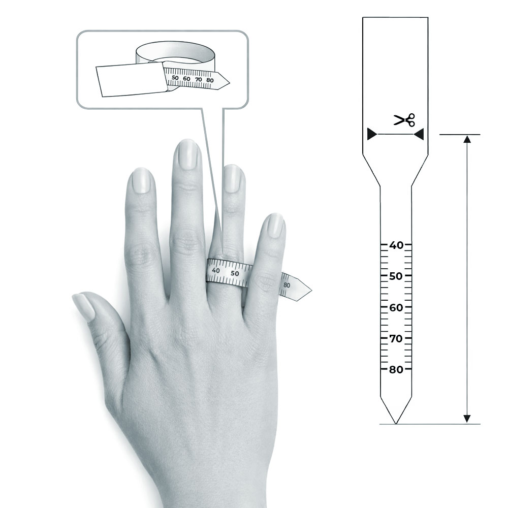 Svoj prstanec izmerite tako, da merilni trak ovijete okoli prsta in koničasti konec potisnete skozi zaponko, da nastane zanka. Zategnite ga toliko, da se prilega tesno, vendar še vedno udobno, pri tem pa pazite, da ne bo pretesen. Številka, ki se poravna s puščico ali oznako na traku, označuje vašo velikost prstana.